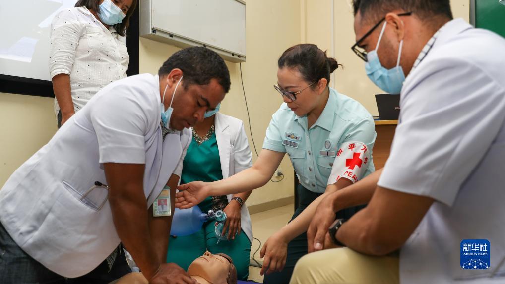 中國海軍“和平方舟”號醫院船在東帝汶訪問期間,派出醫療專家分隊赴東帝汶國立醫院進行ACLS培訓,文職醫護人員為國立醫院醫護人員進行實操講解(9月5日攝)。