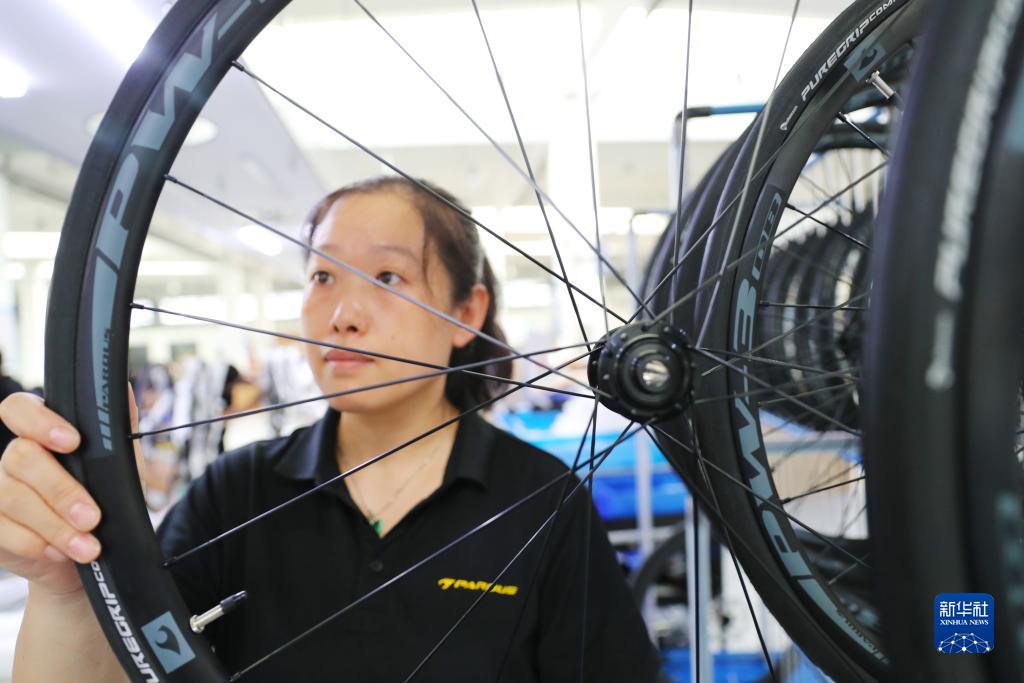 9月9日,在山東樂陵市一家企業的碳纖維自行車生産車間,工人在檢驗輪組。