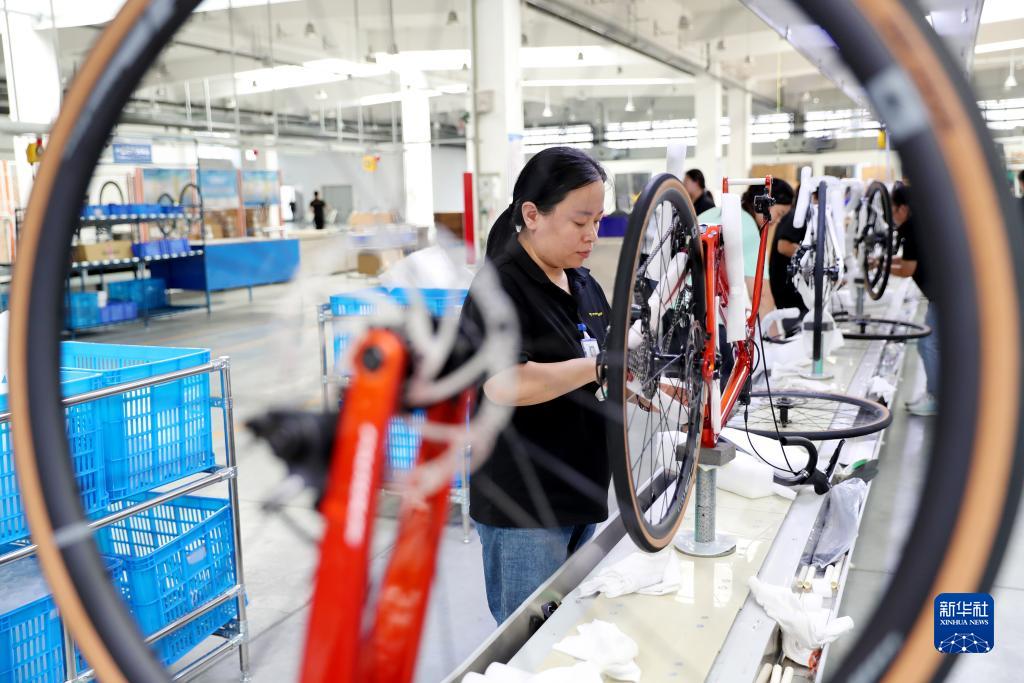 9月9日,在山東樂陵市一家企業的碳纖維自行車生産車間,工人在組裝自行車。新華社發(張進剛 攝)