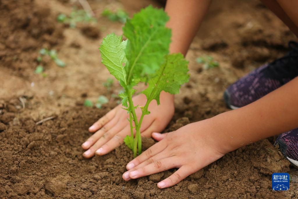 9月9日,在山東省樂陵市朱集中心小學勞動實踐基地,學生在田裏勞作。新華社發(李志軍 攝)
