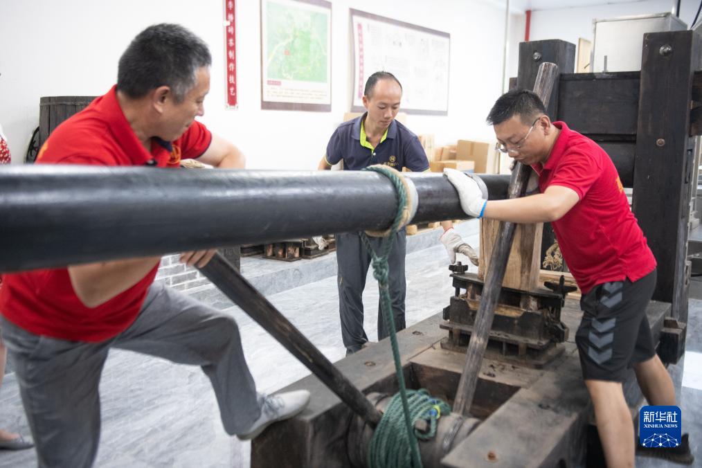 9月9日,工作人員在位於羊樓洞古鎮的趙李橋磚茶製作技藝傳承館展示古法壓茶。新華社發(杜子璇攝)