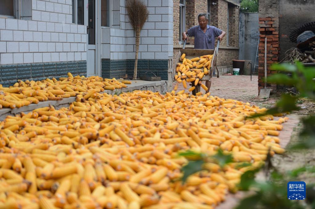 9月9日,鹽山縣小營鄉前陳村農民在晾曬收穫的玉米。