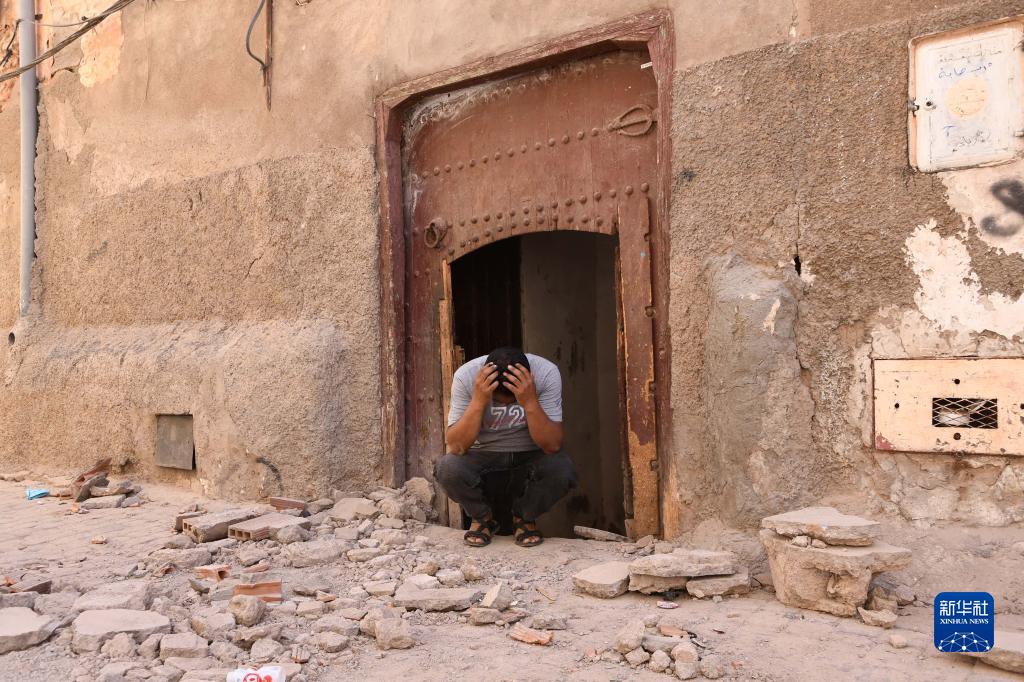 9月9日,在摩洛哥南部城市馬拉喀什,一名男子蹲在自家門口。