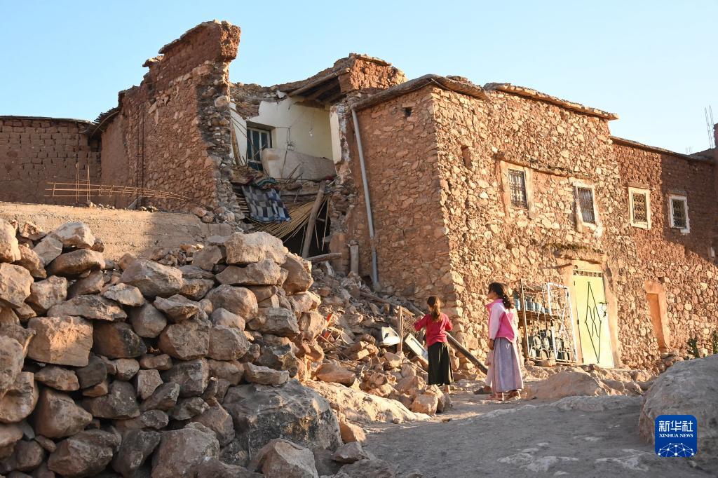 9月9日,在摩洛哥馬拉喀什附近,孩子們站在遭地震損毀的建築旁。