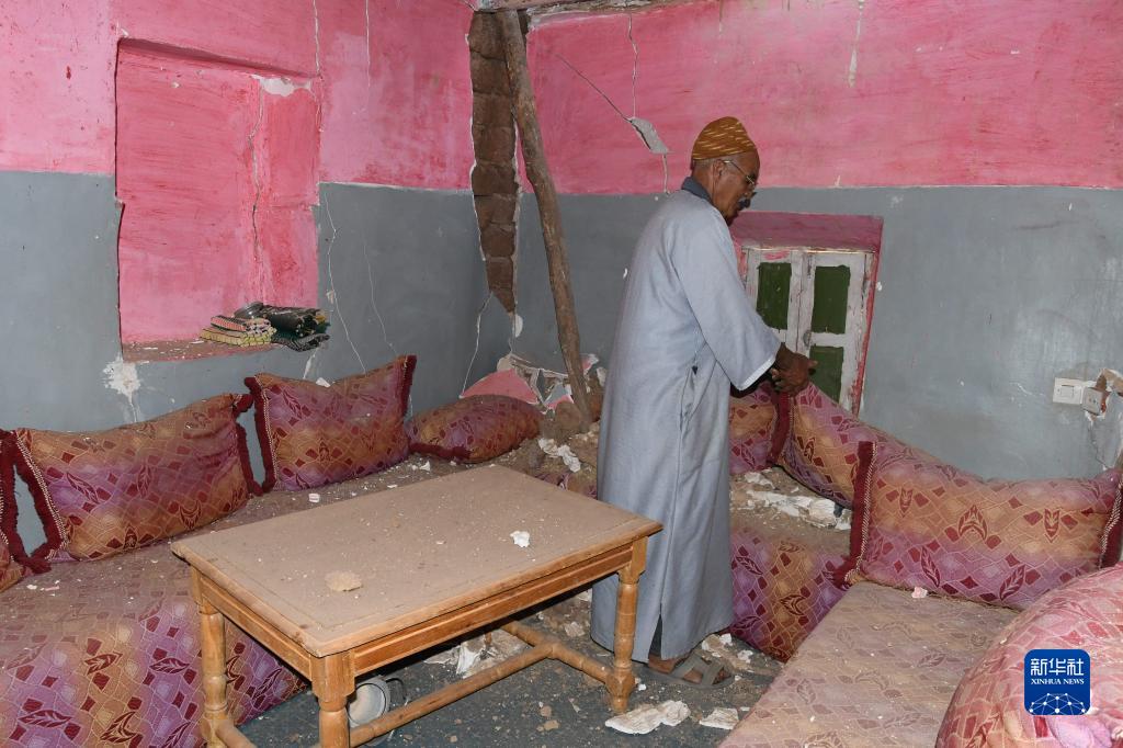 9月9日,在摩洛哥馬拉喀什附近,居民查看遭地震損毀的建築。