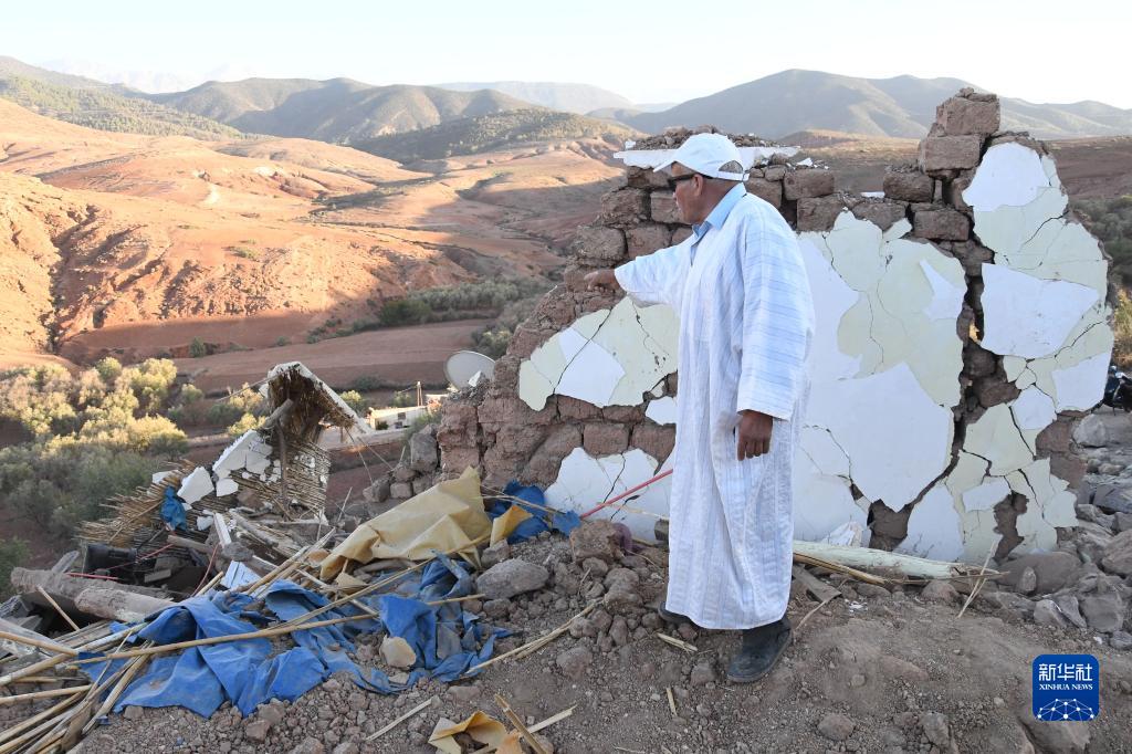 9月9日,在摩洛哥馬拉喀什附近,居民查看遭地震損毀的建築。