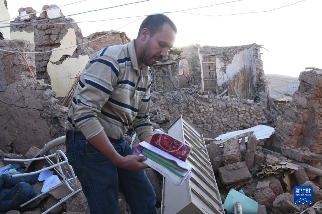 9月9日,在摩洛哥馬拉喀什附近,居民查看遭地震損毀的自家房屋。