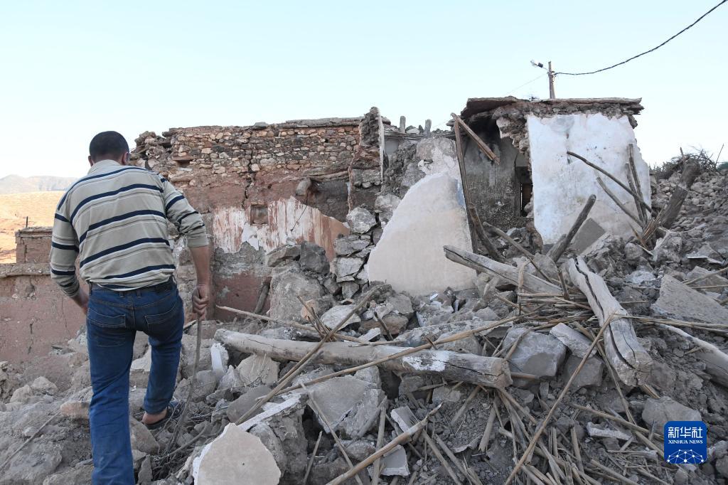 9月9日,在摩洛哥馬拉喀什附近,居民走在遭地震損毀的建築廢墟上。