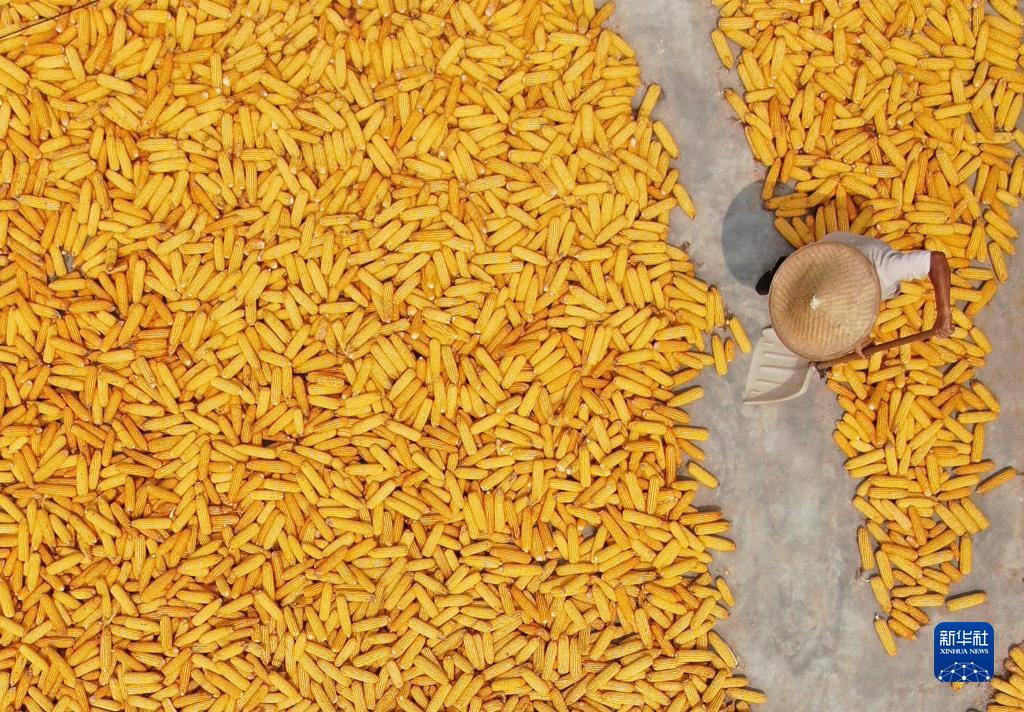 9月10日,在山東省臨沂市地方鎮黃城村,農民在晾曬收穫的玉米(無人機照片)。