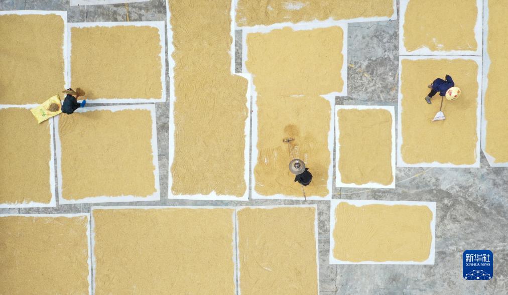 9月10日,村民在貴州省黔東南苗族侗族自治州從江縣剛邊壯族鄉三聯村晾曬稻穀(無人機照片)。
