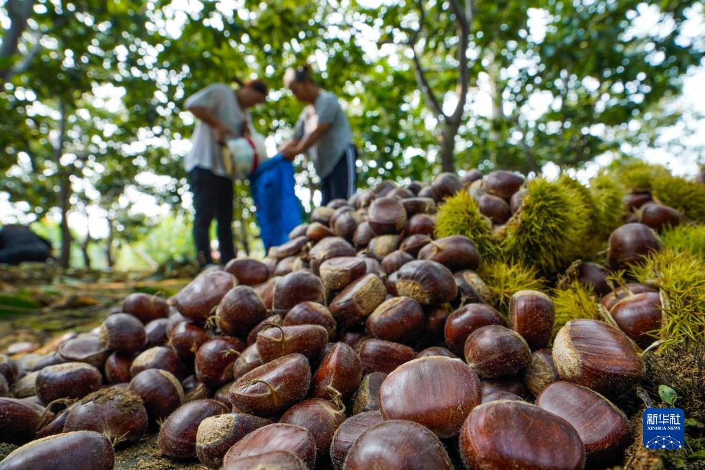 9月10日,河北省遵化市西三里鎮農民在果園收穫板栗。