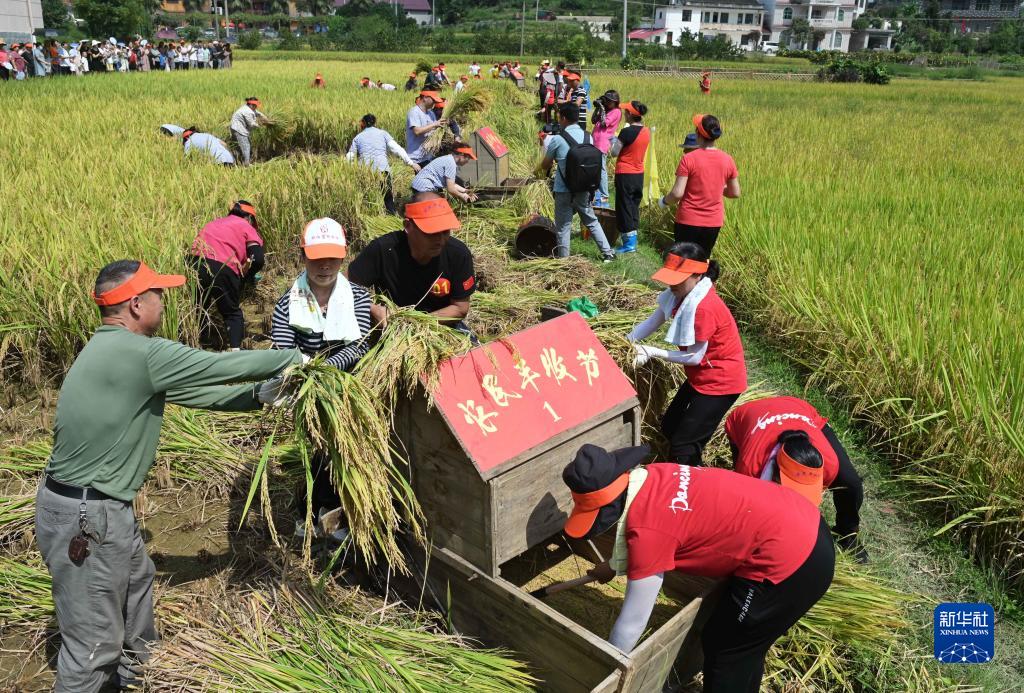 9月9日,在湖南省邵陽市洞口縣文昌街道平棟村一片成熟的中稻田地上,農民在進行一場搶收稻穀比賽。