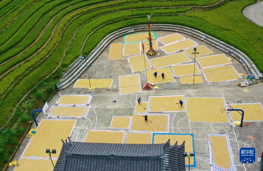 9月6日,村民在廣西融水苗族自治縣白雲鄉高孝苗寨翻曬稻穀。