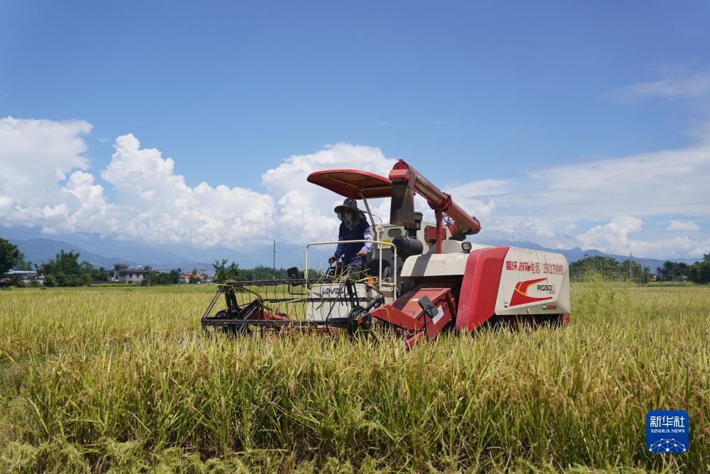 9月8日,村民駕駛農機在雲南省盈江縣弄璋鎮收穫稻穀。
