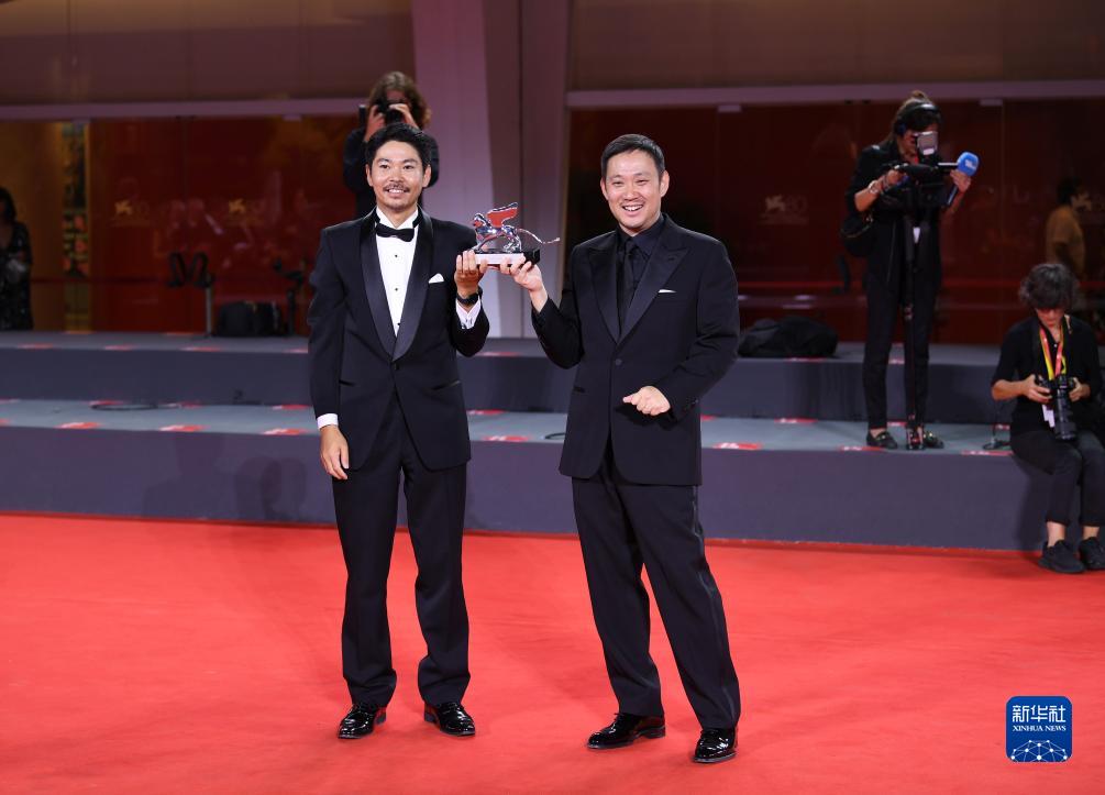 9月9日,在意大利威尼斯,獲得評審團大獎銀獅獎的電影《邪惡不存在》的導演濱口龍介(右)和演員大美賀均展示獎盃。