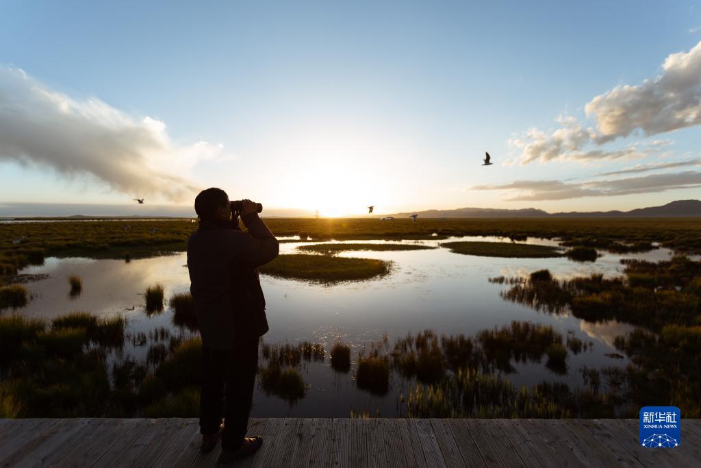 濕地生態管護員如科在四川省阿壩藏族羌族自治州若爾蓋縣花湖用望遠鏡觀察周邊環境(8月22日攝)。