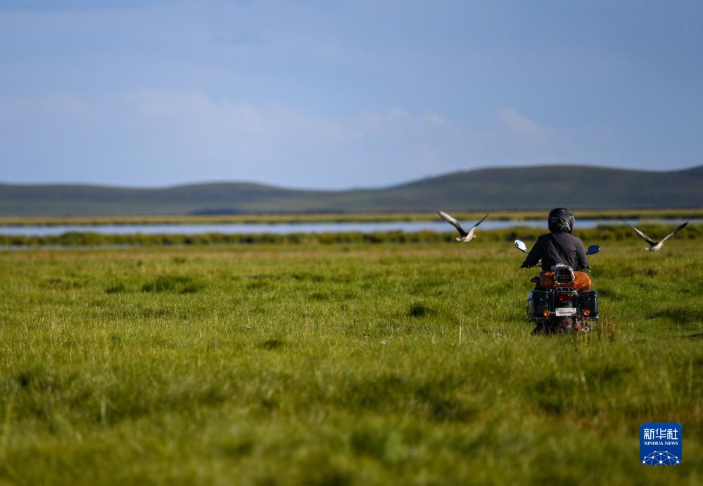 濕地生態管護員如科騎着摩托車在四川省阿壩藏族羌族自治州若爾蓋縣花湖周圍巡查(8月22日攝)。
