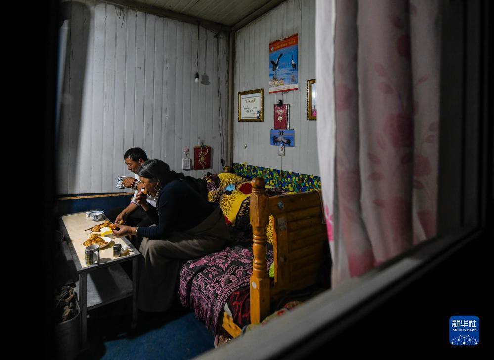 在四川省阿壩藏族羌族自治州若爾蓋縣花湖,濕地生態管護員如科和妻子納麼姐在居住的小屋內吃晚飯(8月22日攝)。