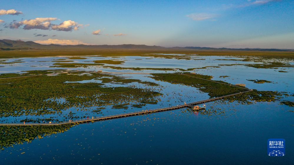 這是8月22日在四川省阿壩藏族羌族自治州若爾蓋縣拍攝的花湖棧道(無人機照片)。