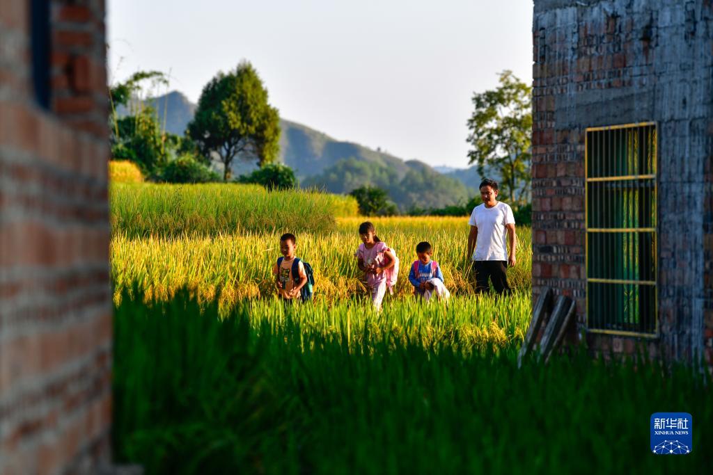 陸成文護送學生放學回家途中經過一片稻田(9月6日攝)。