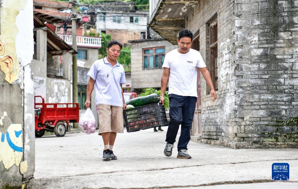陸成文(右)與工勤人員潘德祿搬運從鄉鎮集市上選購回來的學生營養餐食材(9月7日攝)。