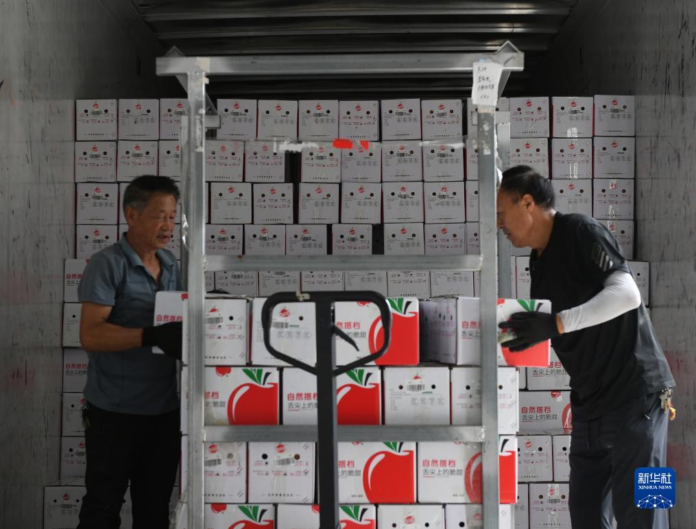 9月10日,在洛川蘋果現代産業園,工作人員將已裝箱的蘋果裝車。