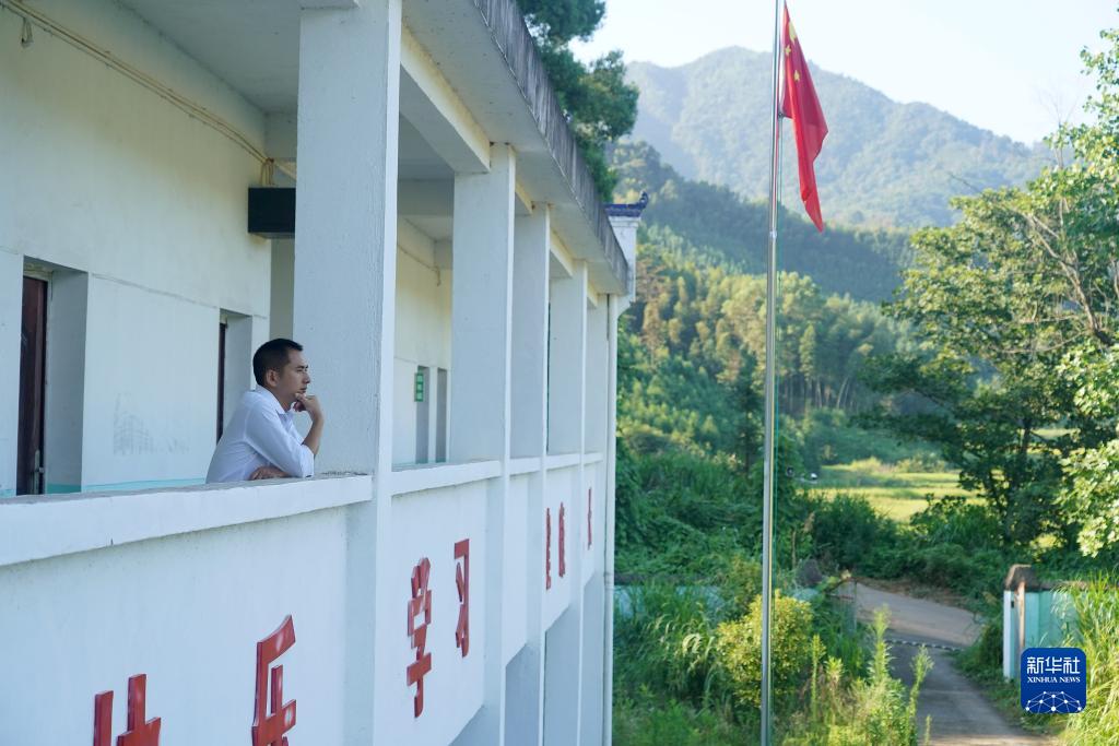 在江西省高安市華林山鎮中心小學朱家教學點,李新江望著空空的校園和遠山(9月4日攝)。