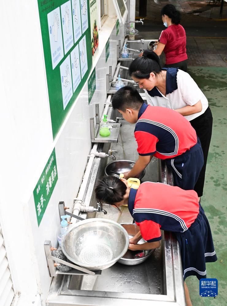 在海南(海口)特殊教育學校,符堯惠(後)指導學生在吃過飯後清洗餐具(9月6日攝)。