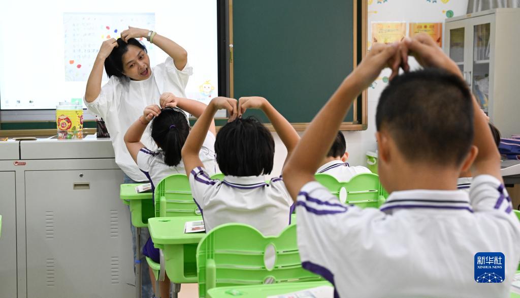 在海南(海口)特殊教育學校啟智三(1)班,班主任符堯惠為學生們上課(9月5日攝)。