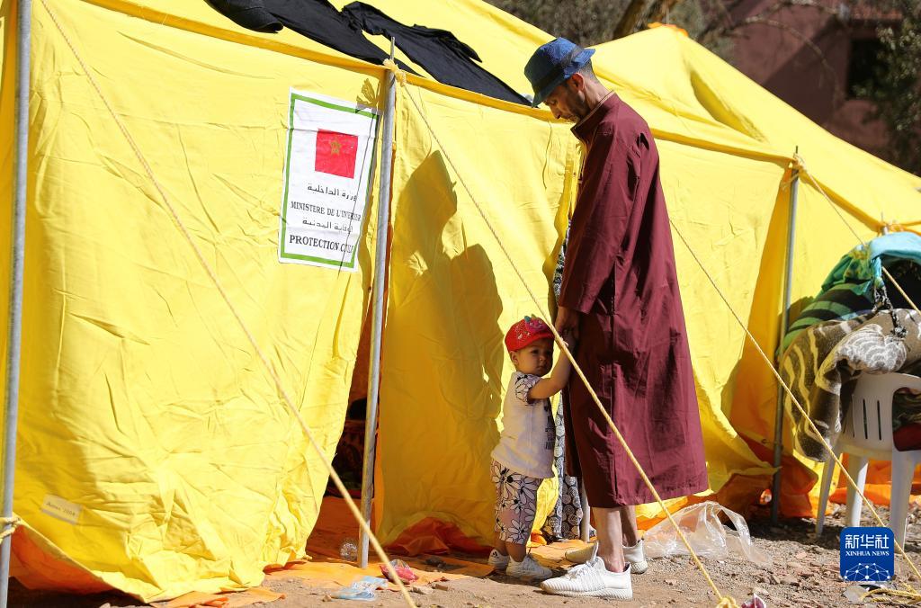 這是9月10日在摩洛哥震中附近的艾米茲米茲村一處臨時安置點拍攝的受災群眾。