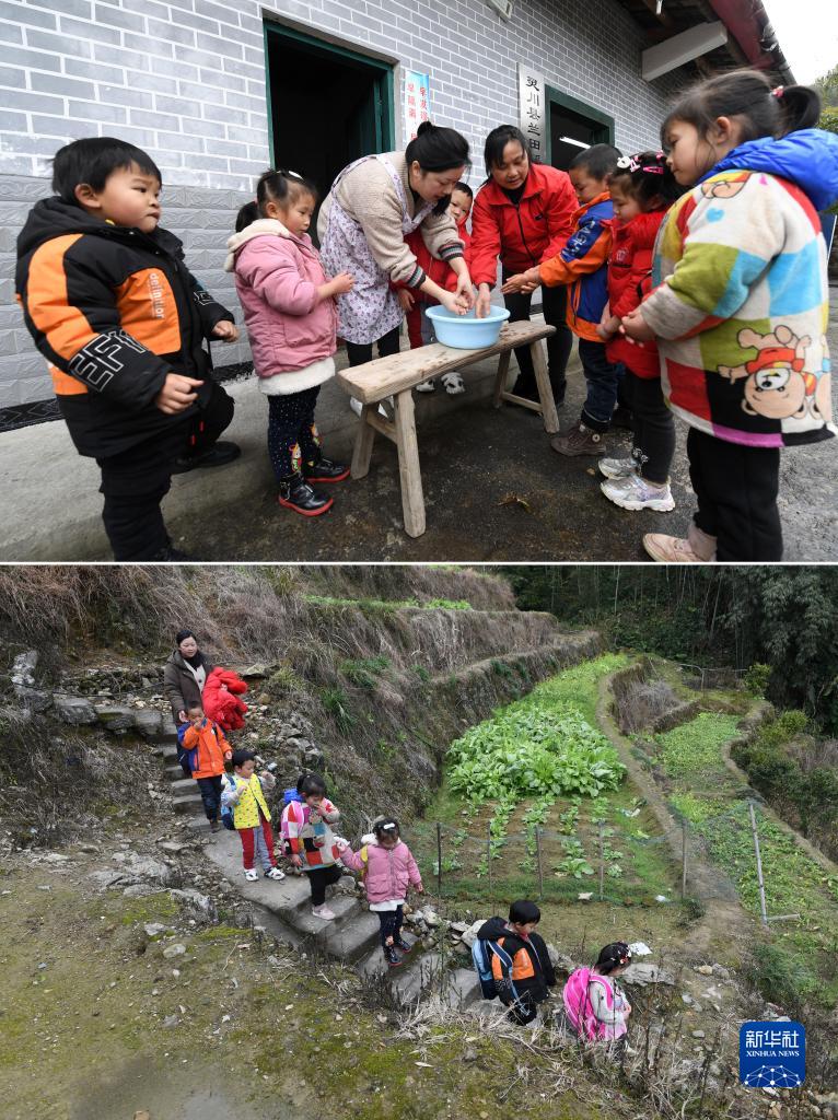 拼版照片:廣西靈川縣蘭田瑤族鄉東良教學點的石夏月(左三)和母親粟秋連帶着學生在午飯前洗手(上圖),石夏月和學生們走在去往學校的山路上(下圖)(2022年2月24日攝)。1988年出生的石夏月,2019年通過考試成為一名教師,到離家30多公里的東良教學點工作,為了兼顧家人和工作,她把兒子和母親接到學校一起生活。