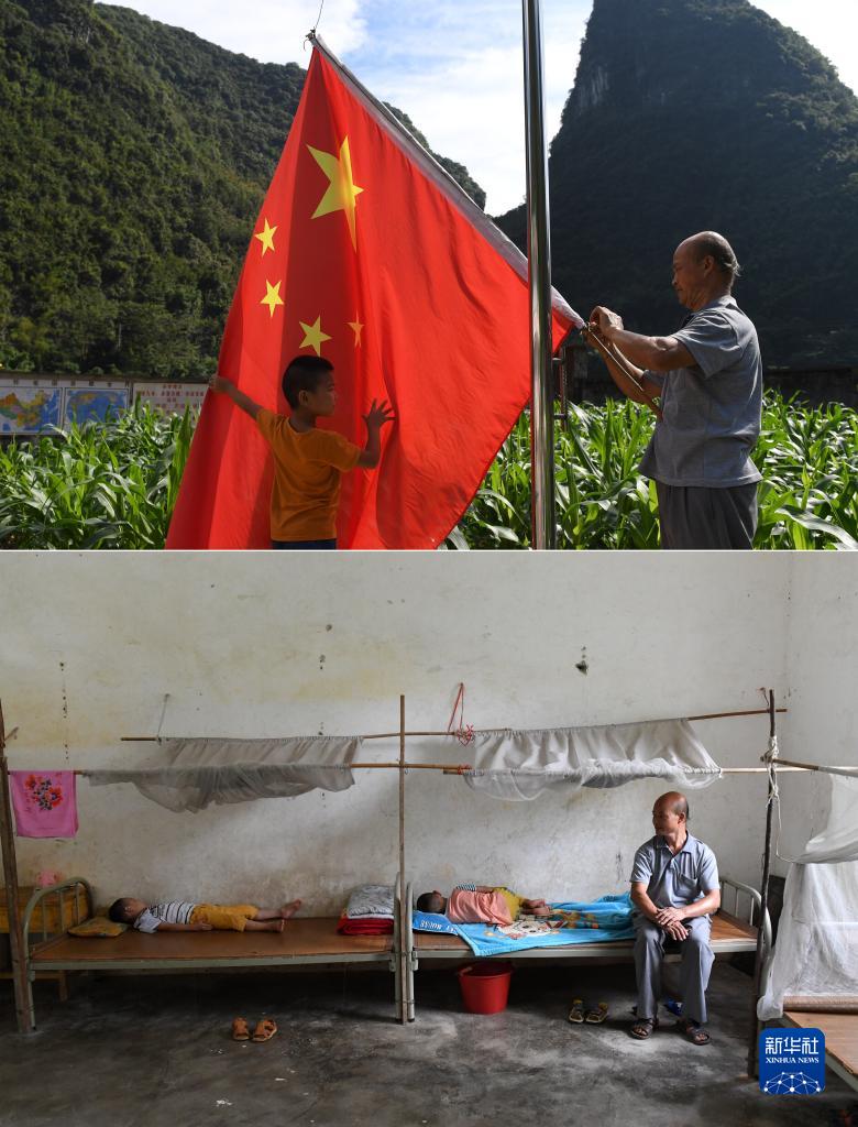 拼版照片:廣西都安瑤族自治縣龍灣鄉琴棋小學的黃若珍老師(右)和學生準備升國旗(上圖),黃若珍老師看護學生睡午覺(下圖)(2017年8月31日攝)。當時,準備退休的黃若珍老師在這片大山講&上已經堅守整整40年,學校有學生寄宿,他每天除了給學生上課,還要給他們做飯,管他們的休息。