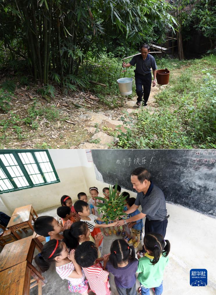 拼版照片:廣西天等縣進結鎮愛樂村龍坡屯龍坡教學點的黃明料老師到附近農家挑水回學校(上圖),黃明料老師接受學生教師節祝福(下圖)(2015年9月10日攝)。當時,黃明料老師是這個教學點唯一的老師,工作日每天騎着摩托車穿越10公里山路到教學點給孩子們上課。學校沒有自來水,日常用水都是他到附近村民家裏挑來。