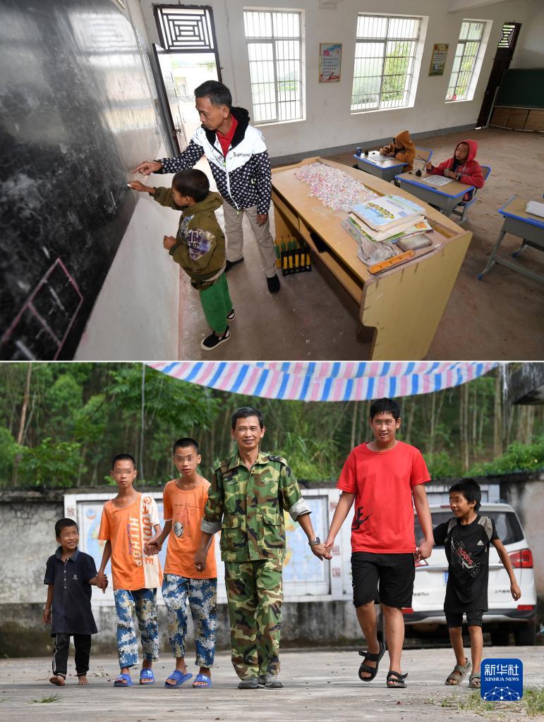 拼版照片:廣西上思縣那琴鄉中心小學逢通村教學點的梁志雄老師給學生上課(上圖,2019年11月19日攝),梁志雄老師和學生課後走在校園裏(下圖,2021年6月16日攝)。梁志雄老師2005年被調到那琴鄉中心小學逢通村教學點,這裡到2017年僅剩梁志雄和三名殘障學生。2020年8月,梁志雄老師光榮退休。但三名殘障學生無法升學到其他學校就讀,梁志雄接受返聘繼續留守。2021年2月,逢通村教學點又來兩名殘障學生,這個教學點成了梁志雄老師和5個殘障學生“一師五生”的學校。