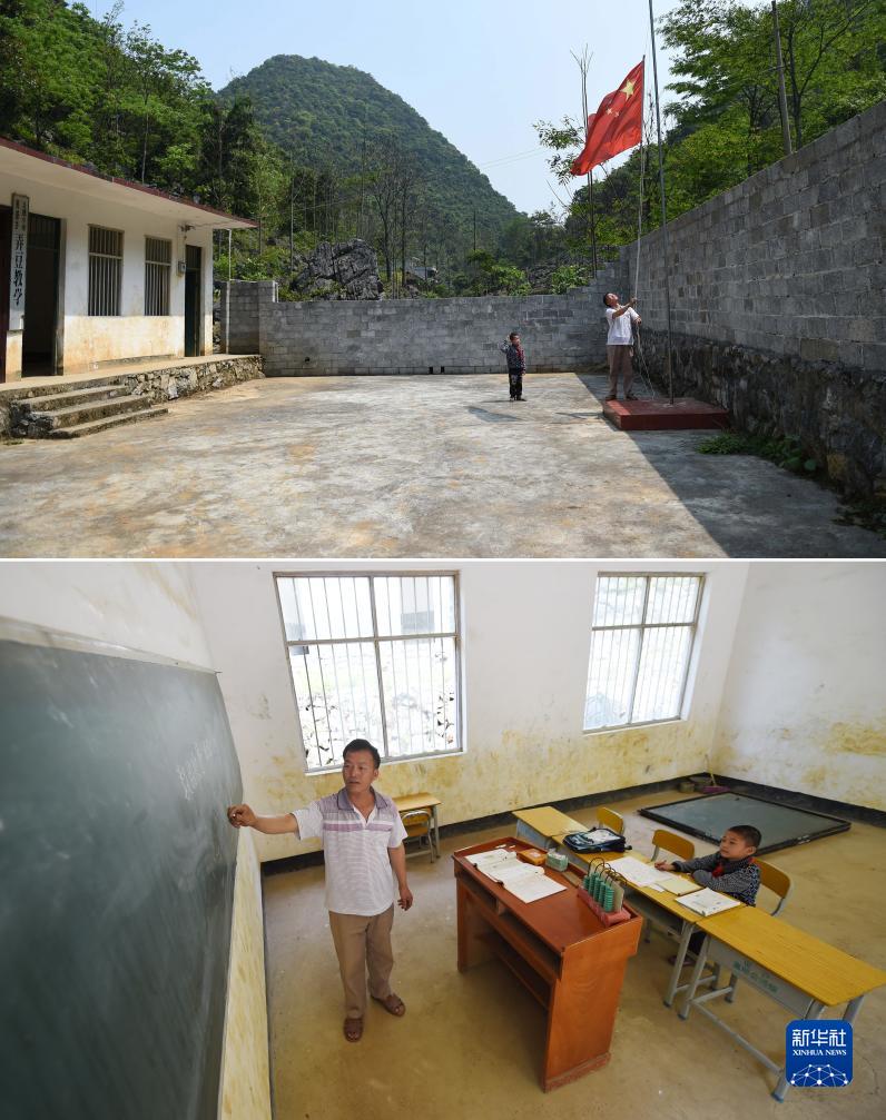 拼版照片:廣西都安瑤族自治縣菁盛鄉義德小學弄豆教學點的藍啟飛老師和學生藍孟源在升國旗(上圖),藍啟飛老師給學生藍孟源上課(下圖)(2015年4月15日)。義德小學弄豆教學點曾有兩個年級近30名學生,2015年只剩下藍啟飛老師和學生藍孟源“一師一生”。工作日,藍啟飛老師要走一個半小時的山路來到這裡,為這裡唯一的學生藍孟源上課。