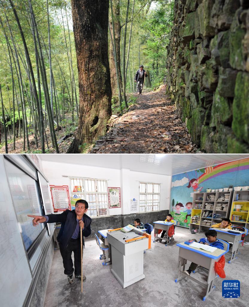 拼版照片:在廣西靈川縣海洋鄉,秦興國走在去中心岐教學點的路上(上圖,2013年3月27日攝)。秦興國老師在廣西靈川縣海洋鄉安泰教學點給學生上課(下圖,2021年10月28日攝)。秦興國是廣西靈川縣海洋鄉一名山區學校老師,因小兒麻痹症致右腳殘疾。從教近30年來,他拄着拐杖已輾轉海洋鄉4所大山學校。