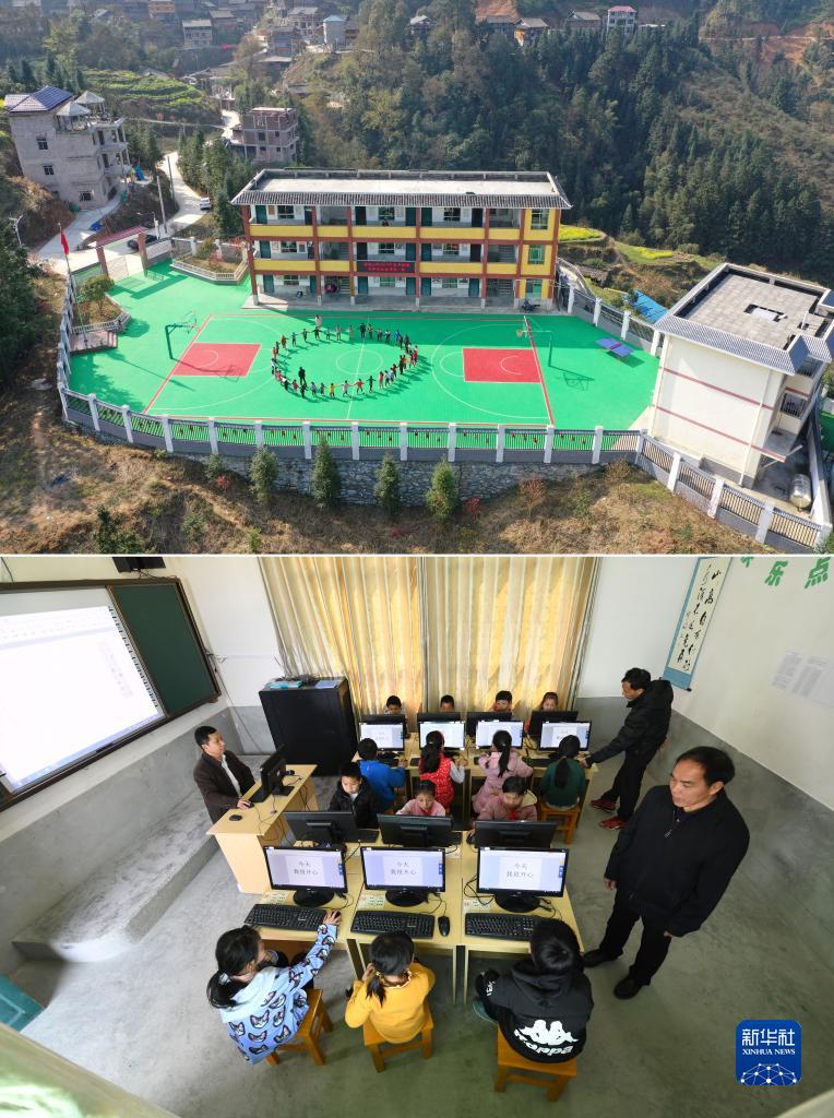 拼版照片:地處黔桂邊界的登曬小學師生在課間一起做游戲(上圖),登曬小學老師在給學生上課(下圖)(2019年3月12日攝)。登曬小學同屬貴州省黎平縣龍額鎮和廣西壯族自治區三江侗族自治縣富祿苗族鄉,是黔桂共建的一個教學點,師生有的來自貴州,有的來自廣西。1956年建校起,一批又一批老師堅守在這所有“一校跨兩省區、兩省區轄一校”之稱的學校裏。