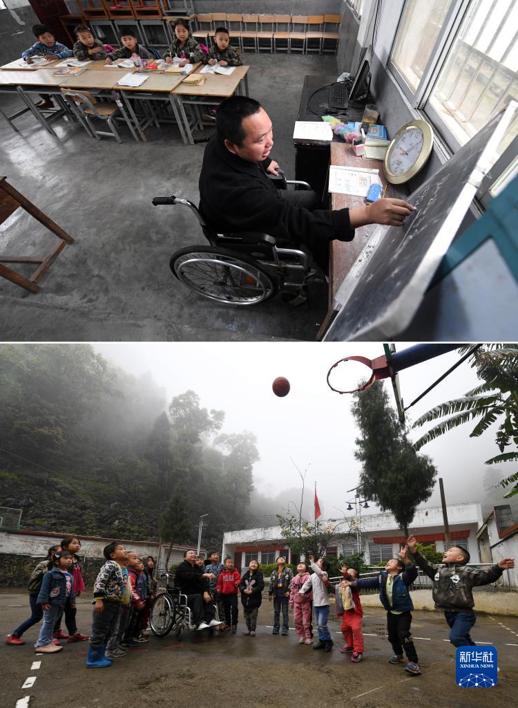 拼版照片:廣西凌雲縣下甲鎮河洲村念恩小學的阮文憑老師給學生上課(上圖),阮文憑老師在課間和學生一起玩籃球(下圖)(2019年3月26日攝)。阮文憑老師因小兒麻痹症致雙腿嚴重萎縮,坐著輪椅堅守大山講&近30年,2010年獲得“中國青年五四獎章”。