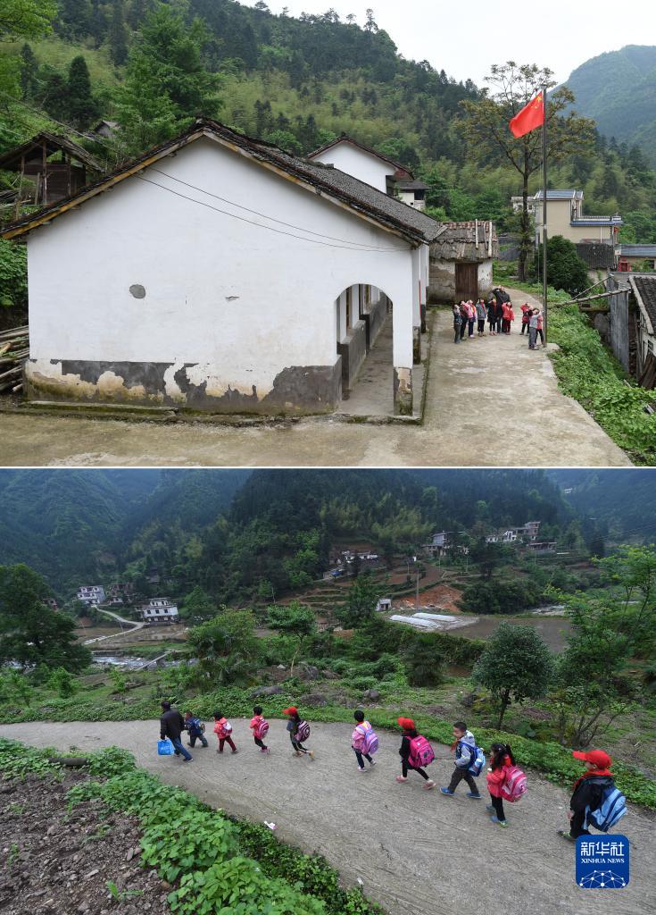 拼版照片:廣西全州縣蕉江瑤族鄉大源村委苦馬田教學點的盧加紅老師和學生一起升國旗(上圖),盧加紅老師中午放學後護送學生回家(下圖)(2016年4月28日攝)。當時,盧加紅是苦馬田教學點唯一的老師。