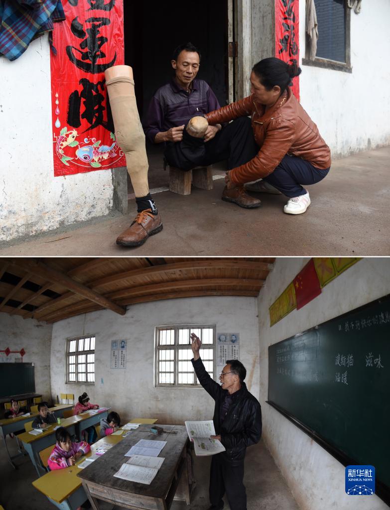 拼版照片:趙德花在野豬殿村的家門口幫愛人李祖清老師穿戴假肢(上圖);廣西灌陽縣洞井瑤族鄉野豬殿小學的李祖清老師給學生上課(下圖)(2016年3月22日攝)。時年61歲的李祖清老師在1981年家訪途中被毒蛇咬傷致小腿肌肉萎縮、骨骼壞死,成了殘疾人,戴着假肢堅守講&。2015年11月,因暫時沒有新老師來接替他的崗位,他退休後接受返聘重回講&。