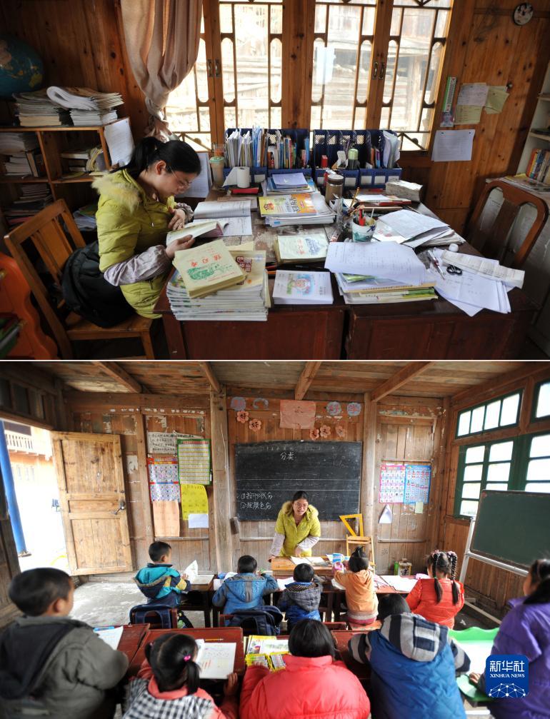 拼版照片:廣西龍勝各族自治縣龍脊鎮小寨村小寨希望小學的賴丁來老師在備課(上圖),賴丁來老師給學生上課(下圖)(2014年3月13日攝)。生長在廣東省廣州市增城區的賴丁來2011年來到小寨村成為一名教師,至今仍然堅守在龍脊鎮教書育人講&上。