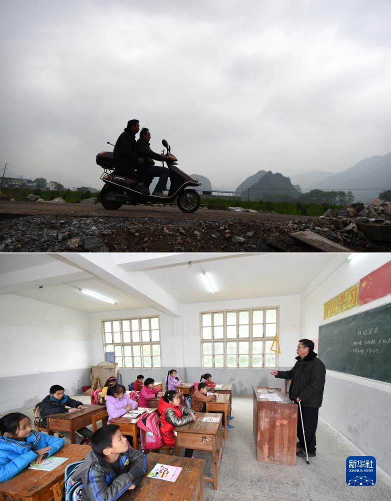 拼版照片:廣西灌陽縣洞井瑤族鄉桂平岩小學的趙仁斌老師(前)用電動自行車載着楊大傑老師去學校(上圖),廣西灌陽縣洞井瑤族鄉桂平岩小學的楊大傑老師給學生們上課(下圖)(2016年3月24日攝)。2015年3月,廣西灌陽縣洞井瑤族鄉桂平岩小學楊大傑老師被診斷為股骨頭壞死,經過一段時間治療後,堅持回到教學崗位上。由於病情未被根治,他每走5分鐘的路就要坐下來休息,學校同事每天輪流接送他上下班。