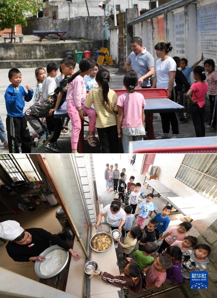 拼版照片:廣西德保縣東凌鎮那王小學的黃永勇和黃秀碧課間和學生在一起休息(上圖),黃永勇(左一)和黃秀碧在給學生分午餐(下圖)(2023年3月22日攝)。廣西德保縣東凌鎮那王小學地處山區,學校只有黃永勇和黃秀碧這對“夫妻檔”老師。在這裡,他們倆除了給學生上課,為學生做午飯,晚上還要照顧離家較遠住校的學生,只有周末才能回家。