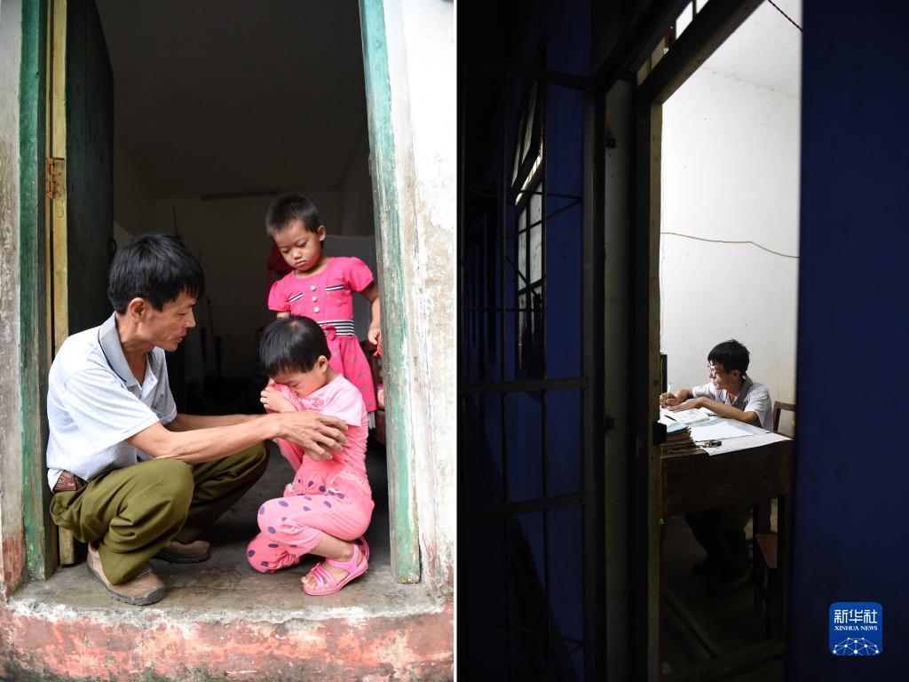 拼版照片:廣西東蘭縣三石鎮泗爺小學的黃英雄老師在安慰一名因想家而哭泣的寄宿生(左圖),黃英雄老師在備課(右圖)(2014年9月10日攝)。2014年,時年50歲的黃英雄老師已在大山裏工作28個年頭,泗爺小學當時有學生31名,分3個教學班,教師只有黃英雄一個人。