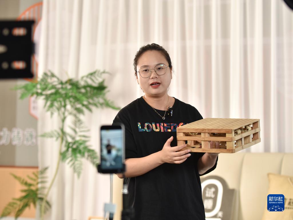 9月10日,在湖南省婁底市雙峰高新區一竹製品生産企業,銷售人員在直播介紹竹芯床墊小樣。