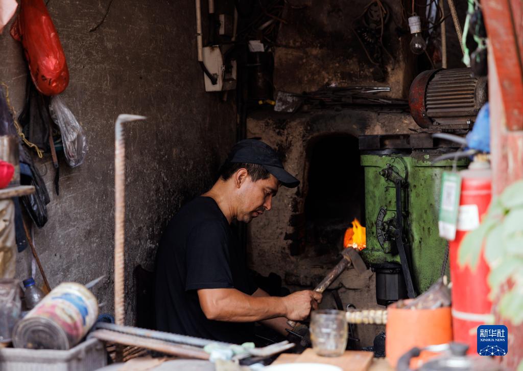 在新疆喀什古城景區內,手藝人在製作鐵器(9月7日攝)。
