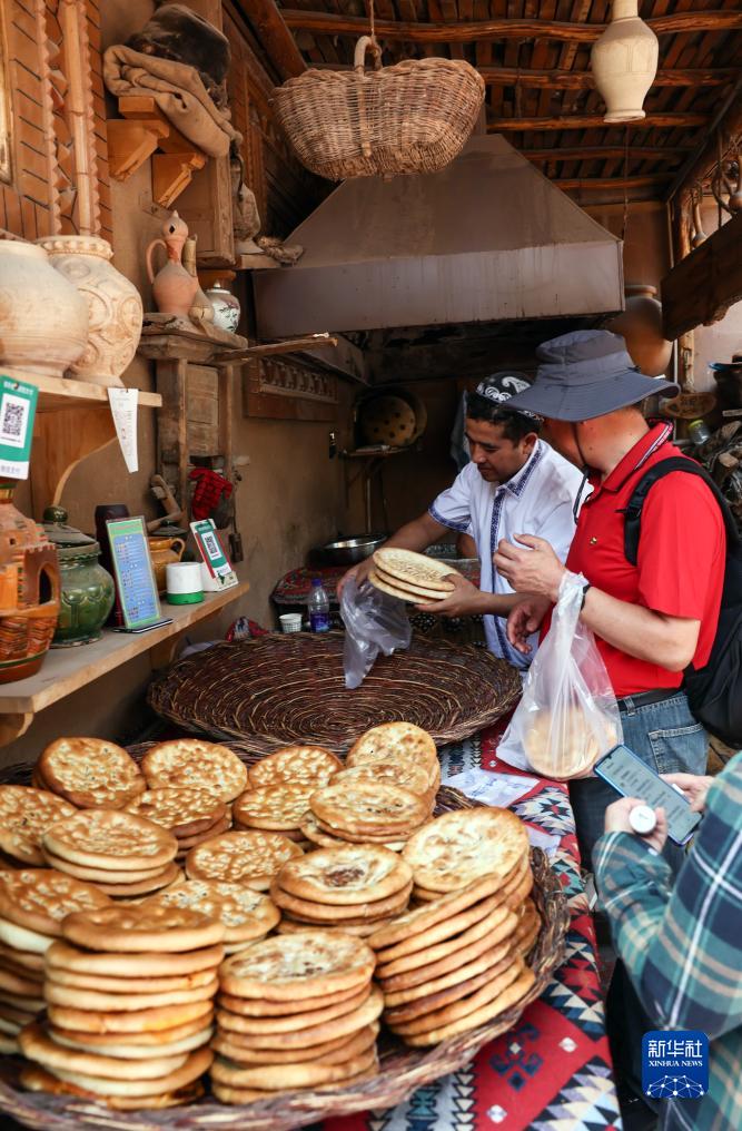 在新疆喀什古城景區“爺爺的爺爺的爸爸的馕”打馕店,游客在買馕(9月7日攝)。