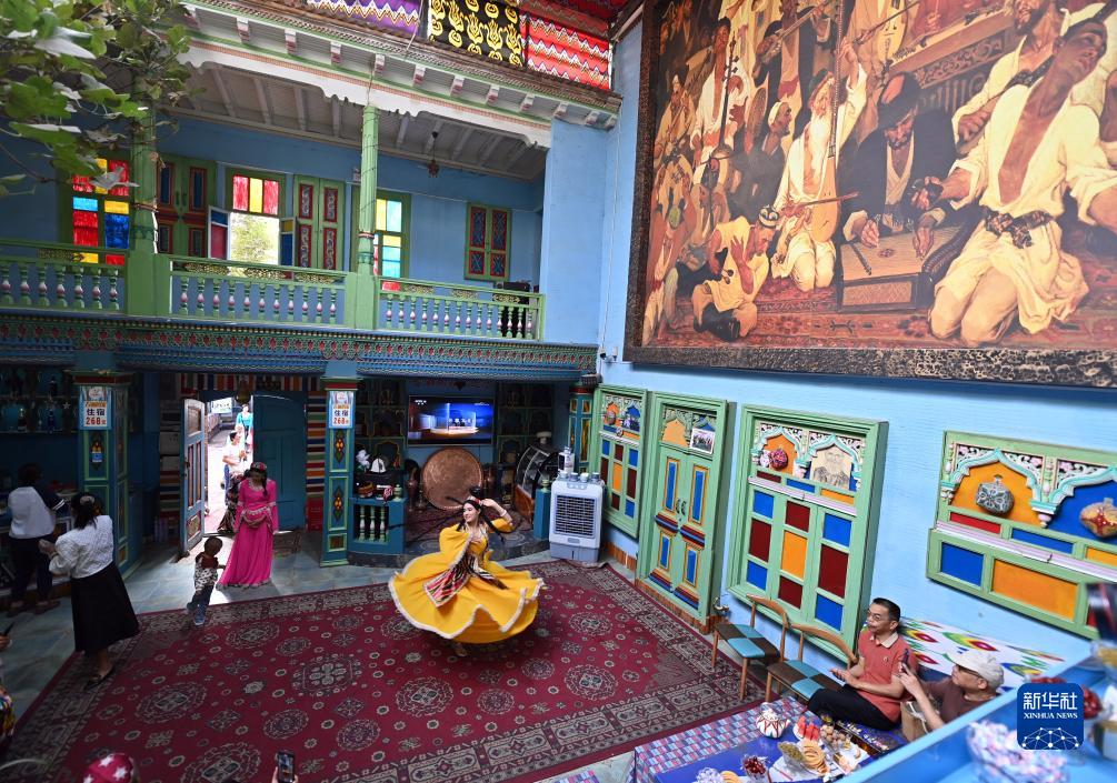 在新疆喀什古城景區“古麗的家”旅游家訪點,演員在隨音樂起舞(9月7日攝)。