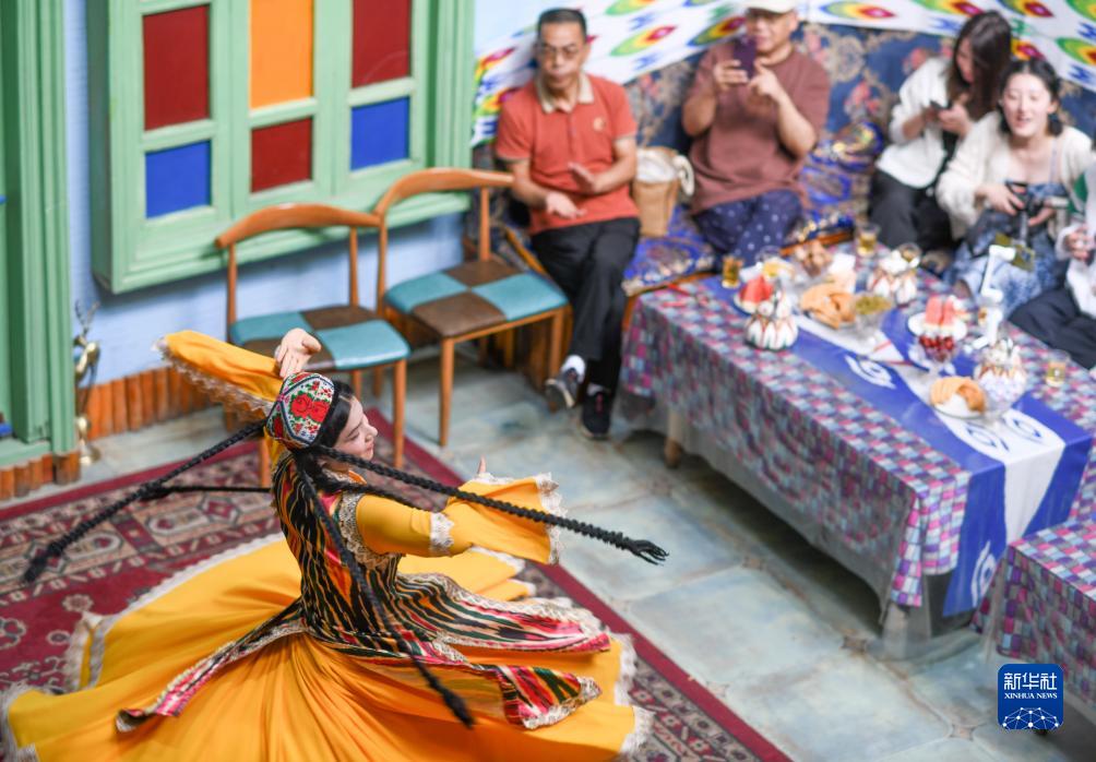 在新疆喀什古城景區“古麗的家”旅游家訪點,演員在隨音樂起舞(9月7日攝)。