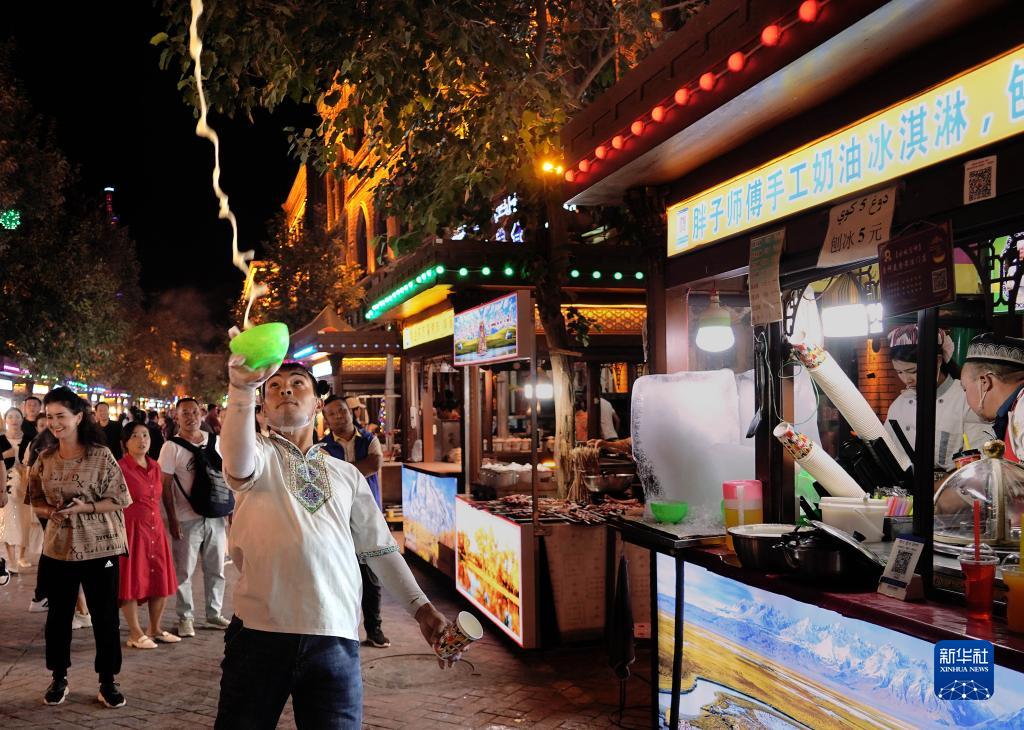 在新疆喀什古城景區內,工作人員在夜市上出售美食(9月4日攝)。